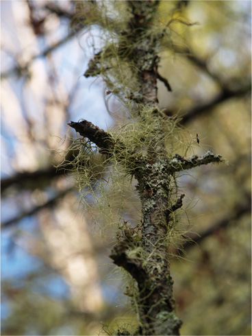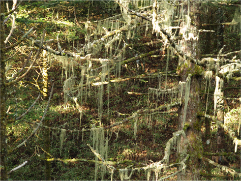 | とろろ昆布みたいなサルオガセという地衣類が繁茂して、お化け屋敷と化した枯れ木。 |