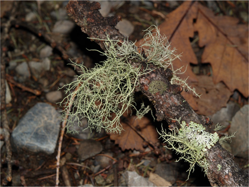 | サルオガセの仲間、ヤマヒコノリ。地面に落ちた枯れ枝についているのを、よく見かける。 |