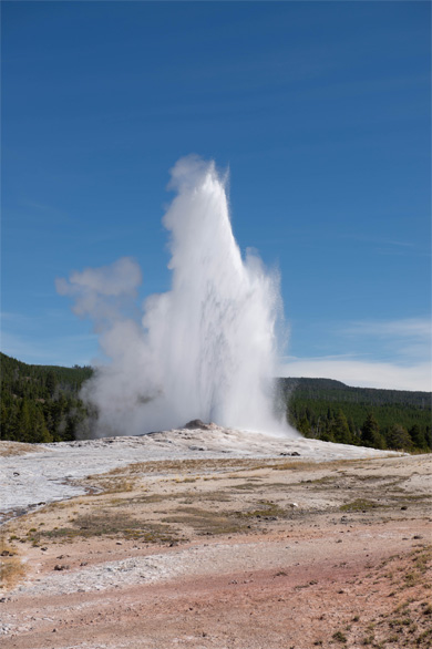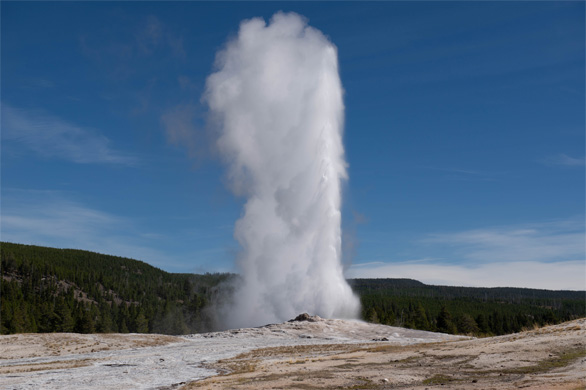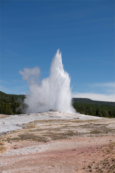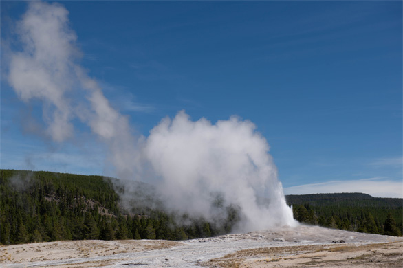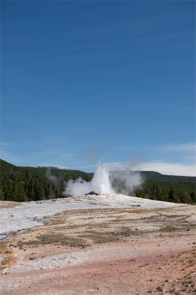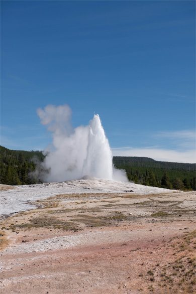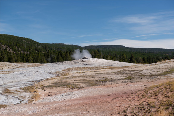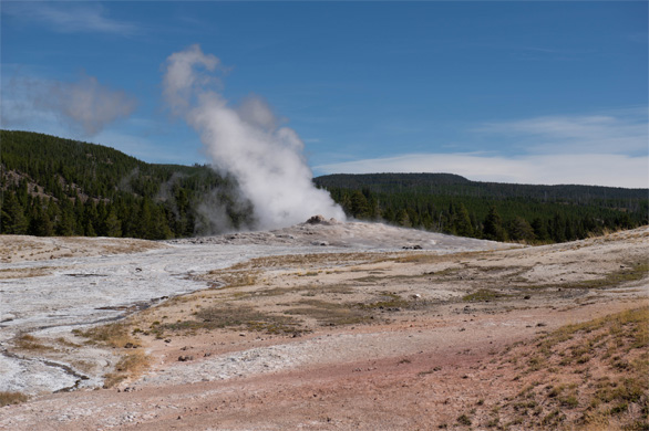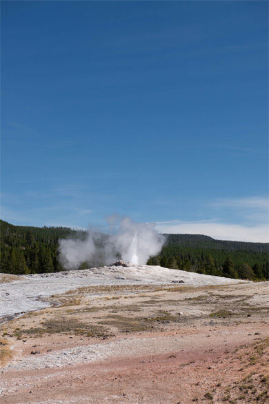 水蒸気の塊が一つ、低い丘のてっぺんに上がっていた。オールド・フェイスフル・ガイザーだ。ガイドさんが間もなく噴出が始まるというので、丘を望む展望デッキに急いだ。