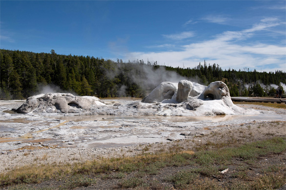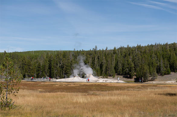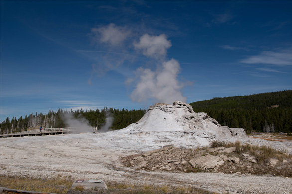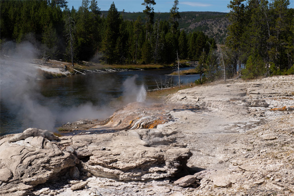 | ↑ファイアホール川の川岸の間欠泉、2つ。正面で熱水を吹き上げているのはファン・ガイザー。左手前で水蒸気を上げているのはモルタル・ガイザー。 |