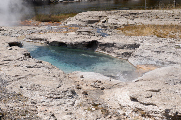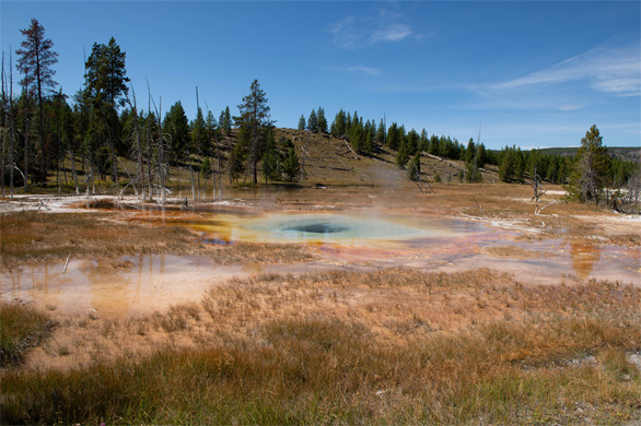 | ↑スクエア・スプリングの北にある温泉。流れ出る温水の下の地面に藻類が繁殖して、オレンジ色や焦げ茶色の縞模様になっている。 |