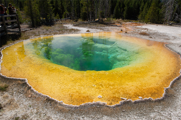 オールド・フェイスフル・ガイザーのある地区でお昼休みの予定だったが、急きょ、「モーニング・グローリー・プール」という温泉まで遠足することになった。この温泉は漏斗のような形をしているため、「モーニング・グローリー」(朝顔)という名前が付いたそうだ。