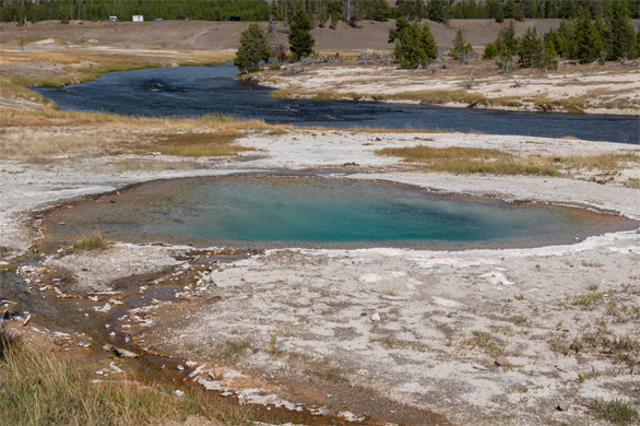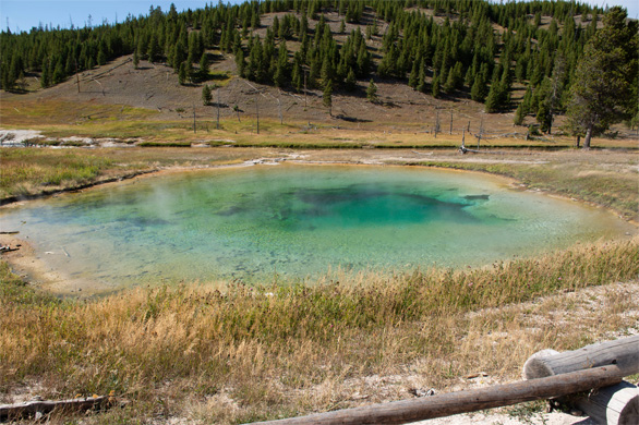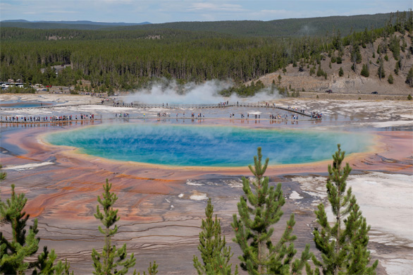 | ↑長径90m。青とエメラルドグリーンの泉を、藻類の黄色やオレンジ色が縁取る。全体が虹色に見える様子が、プリズムによって分散された光を想起させることから、「プリズマティック」との名前が付いた。風の強い日は観光客の帽子がいくつも飛ばされて水面を漂うそうだけど、どうやって回収するのかな?そもそも回収できるのかな。 |