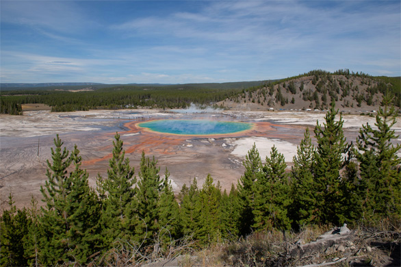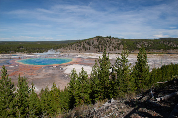 ファイアホール川の岸辺の駐車場で車を降り、山道を登った。数あるイエローストーン国立公園の温泉の中でも特に有名な、グランド・プリズマティック・スプリングを山の中腹から眺めるためだ。山歩きをいとわないメンバーばかりだったため、ガイドさんが「温泉の周りに遊歩道がありますが、とても大きな温泉なので、少し離れた高い場所から見下ろしましょう」と、山道のコースを案内してくれた。