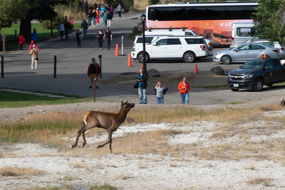 | ↑エルクの子が、道路(写真のずっと右奥)を渡ったお母さんを追いかける。エルクに気づいた観光客が道路脇に集まってくると、ちびっこは立ち止まって右往左往。観光客に向かってレンジャー(自然保護官)さんが「道を開けて!」と呼びかけ、人が離れると、ちびっこはお母さんの元に駆けて行った。マンモス・ホットスプリングスにて。 |