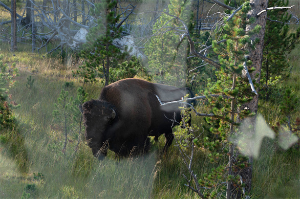 | ↑木立の間からバイソンがのっそり姿を現した。車窓から写す。バイソンは群れでいるものとばかり思っていたけれど、1頭だけぽつんといるのをよく見かけた。 |