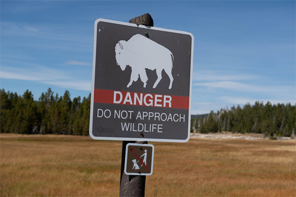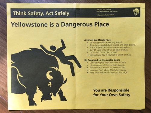 イエローストーン国立公園に初めて入った時、入場門の係員さんから下の写真のパンフレットなど、「観光心得」をいくつか渡された。公園の紹介や、大自然の中に滞在するにあたっての注意事項が書かれているが、どのパンフレットでもひときわ目を引くのが、動物に関する警告だ。そういえば、公園に入る前にまずガイドさんから話があったのも、野生動物に対する心構えだった。それほど事故が多いのだろう。