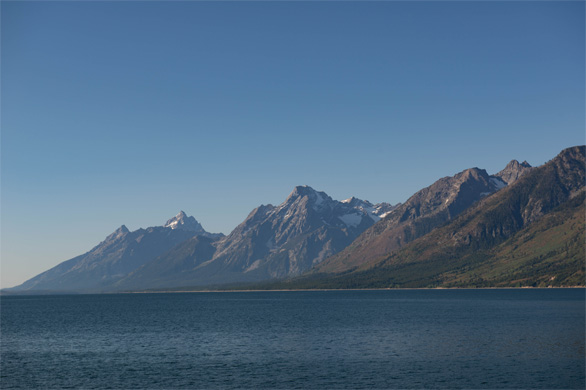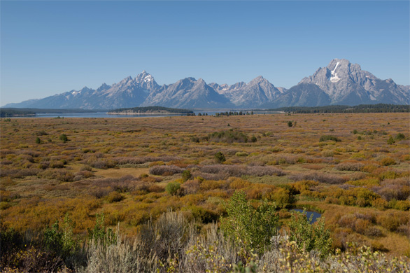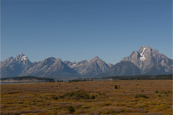 ![]() ジャクソン湖とティトン山脈 イエローストーン国立公園をあとにし、南隣のグランドティトン国立公園へ。ティトン山脈と湖と秋の草原が織り成す景観を堪能した。
