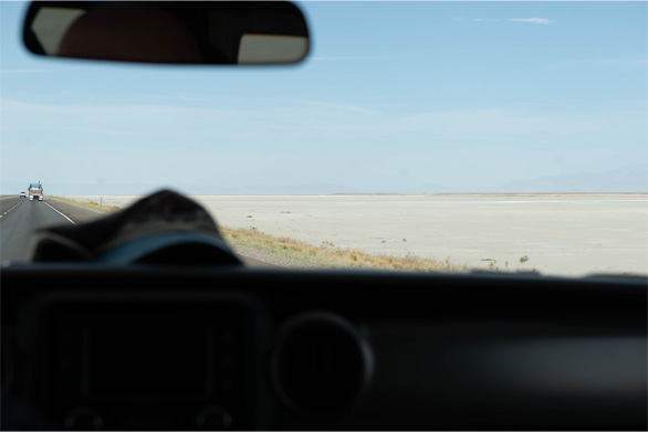 | ↑グレートソルト湖を出発して45分。草原が白っぽくなってきた。 |