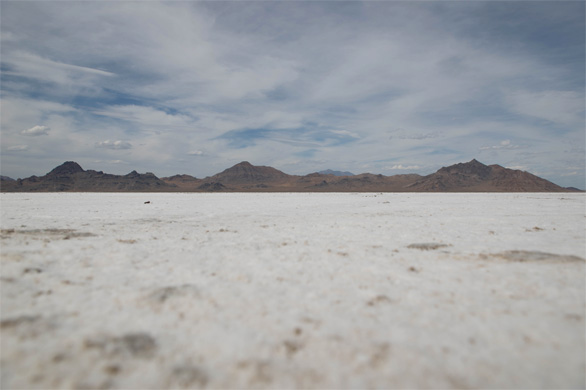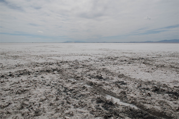 「ソルトフラッツ」(salt flats)は「塩類平原」とか「塩原」と訳される。塩湖の水が干上がり、あとに塩やミネラルが残されてできた地形で、ボンネビル・ソルトフラッツはアメリカ最大の塩原だそうだ。でこぼこがなく真っ平らなことから、モータースポーツの格好の会場になっている。私たちが訪れたちょうど前の日には、ロケット自動車などがスピードを競う「ワールド・オブ・スピード」が開催された。