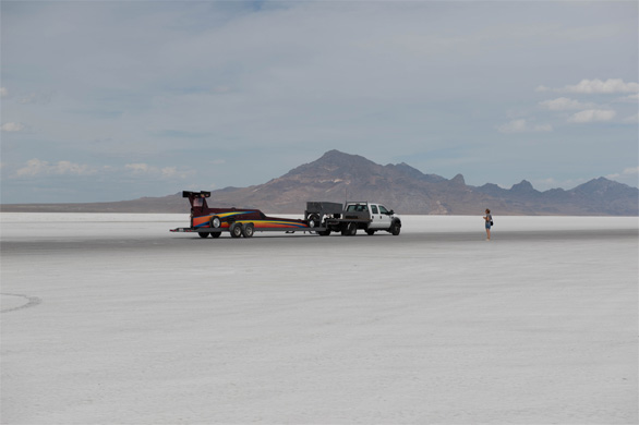 | ↑ロケット自動車を目撃。文字通りロケットエンジン搭載で、最高時速は1,000kmを超えることもあるそうだ。「白い塩原を疾駆する姿、カッコイイだろうな〜」とのんびり見送っていたが、前日のレースではロケット自動車が1台、時速560kmで事故を起こして大破し、ドライバーさんが大怪我をして空中搬送されたそうだから、大きな危険がつきまとう競技には違いないだろう。 |